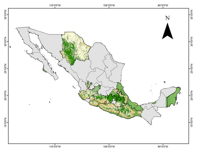 The study area included the states of Chihuahua, Guerrero, Jalisco, Oaxaca, Michoacán, Puebla, State of Mexico, Hidalgo, Tlaxcala, Veracruz and Quintana Roo (Figure 1). The first nine, in addition to Durango, account for 90 % of the country's timber production (5.94 million m3) (Secretaría de Medio Ambiente y Recursos Naturales [SEMARNAT], 2015) and they are included in the National Sustainable Forest Management Strategy for Increased Production and Productivity (ENAIPROS for its initials in Spanish) of the National Forestry Commission (CONAFOR for its initials in Spanish).