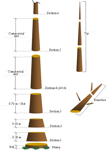 Sampling was conducted by regions, considering as such the Regional Forest Management Units (RFMUs) defined by CONAFOR. Field data were obtained by destructive sampling by taking advantage of the harvest areas of the forest stands. The following variables were measured: diameter at breast height (dbh) outside and inside bark (d in cm), total height (h in m), diameter outside and inside bark (d i in cm) for each section at the height that was found relative to the ground (h i in cm), and diameter outside and inside bark of all the branches whose diameter at the base was greater than 5 cm. Two 0.30-m sections above the stump were obtained; the next section corresponded to the dbh (1.30 m) and it was followed by 2.54-m-long (or another commercial size depending on the region or state) sections until reaching the tip of the tree (Figure 2).