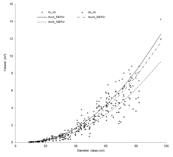 Once the best model for stem volume and total volume was selected, a system of additive equations was simultaneously fitted to estimate the volume of branches with bark (vbr wb ), stem with bark (tsv wb ) and total tree with bark (ttv wb ):