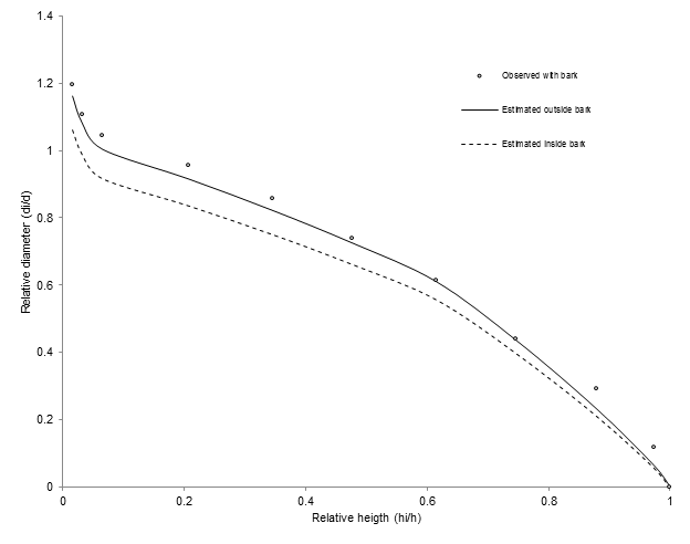 Figure 4 shows the fit of the taper model selected for a tree with a dbh of 45 cm and a height of 20 m.