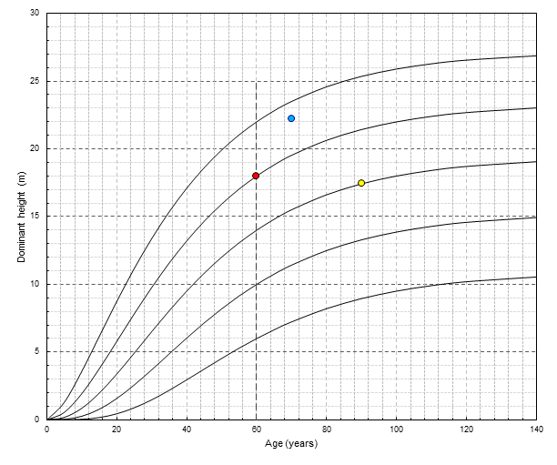 c) dominant height H 1 at given age t 1 from SI (SI = 14 m, t ref = 60 years, t 2 = 90 years, H 1 = ?) (yellow dot in Figure 5).
