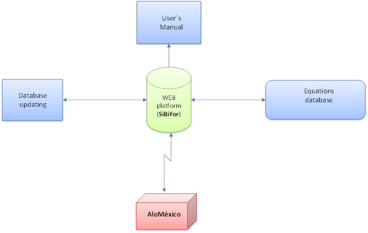 The digital platform was developed in the PHP programming language (interpreted programming language), a free software with support to connect to a variety of databases such as MySQL, PostgreSQL, mSQL, Oracle, and to design and layout HTML5 and CSS3 web interfaces, as well as different frameworks that make use of these technologies. The platform can be accessed from any Internet browser such as Microsoft Internet Explorer, Google Chrome, Mozilla Firefox or Safari. SiBiFor can be accessed through the link http://conafor.gob.mx/sibifor. The platform was designed considering the same central structure of AloMéxico, an allometric biomass model database, to allow compatibility with this system and the exchange of information between the two applications.