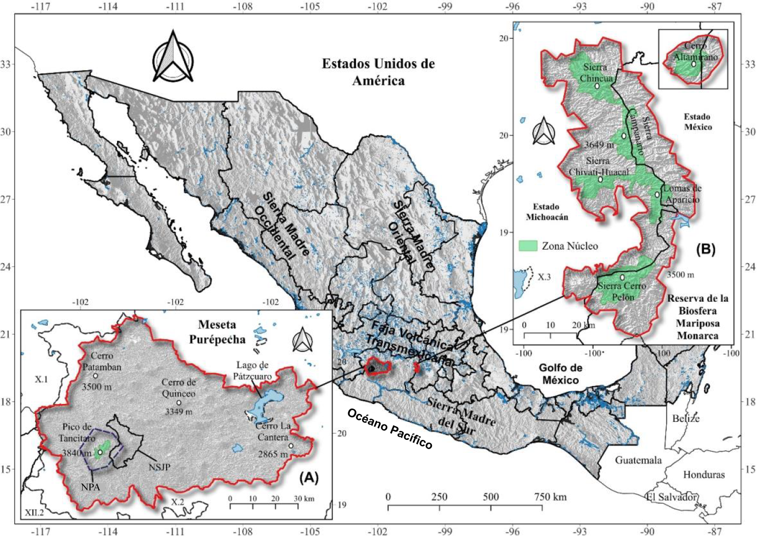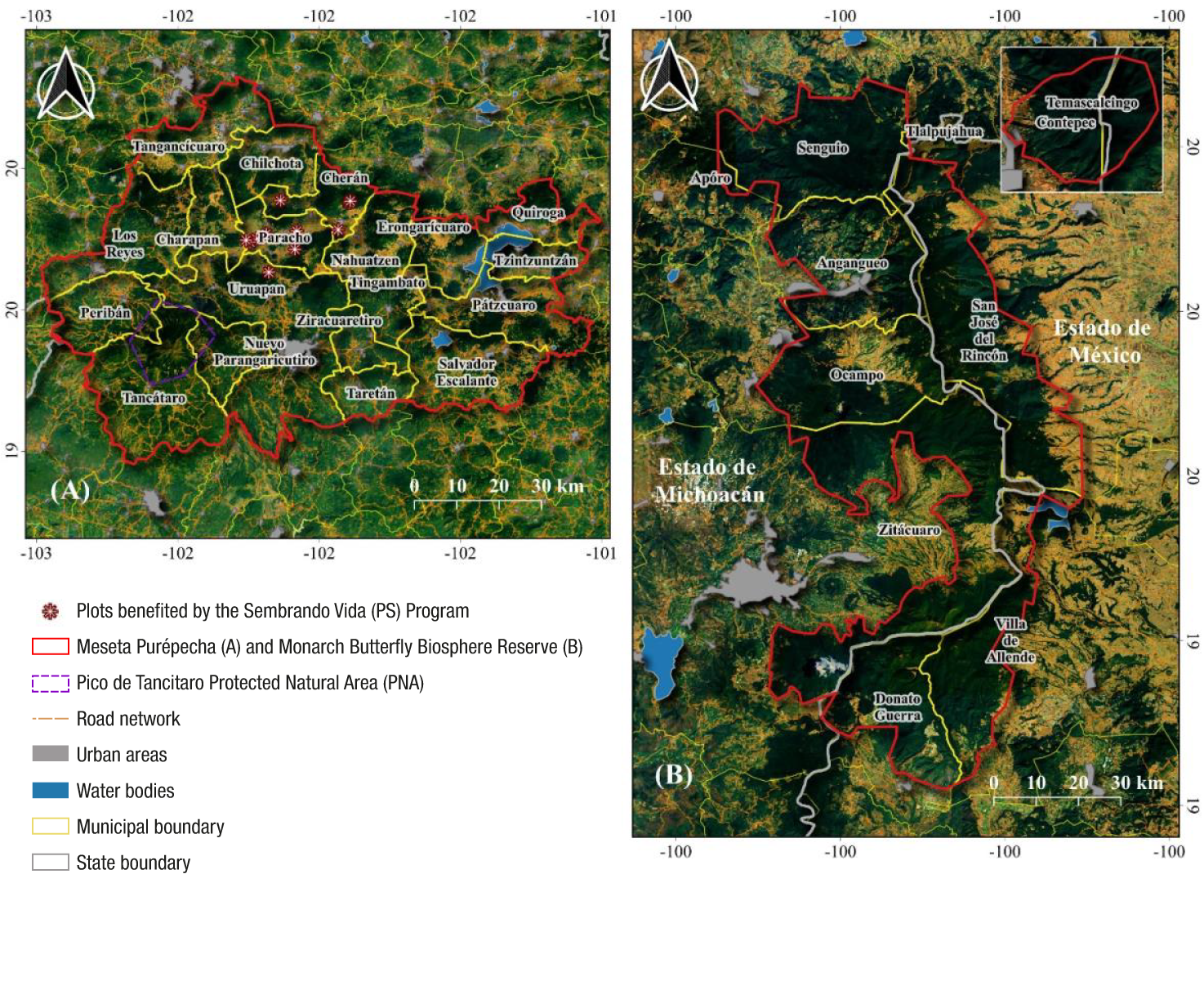 The study areas consist of the Meseta Purépecha in Michoacán, covering an approximate area of 660 000 hectares, and the Monarch Butterfly Biosphere Reserve (MBBR) on the border between Michoacán and Estado de México, with an approximate area of 56 256 hectares. Both areas are located within the Trans-Mexican Volcanic Belt (Figure 1).