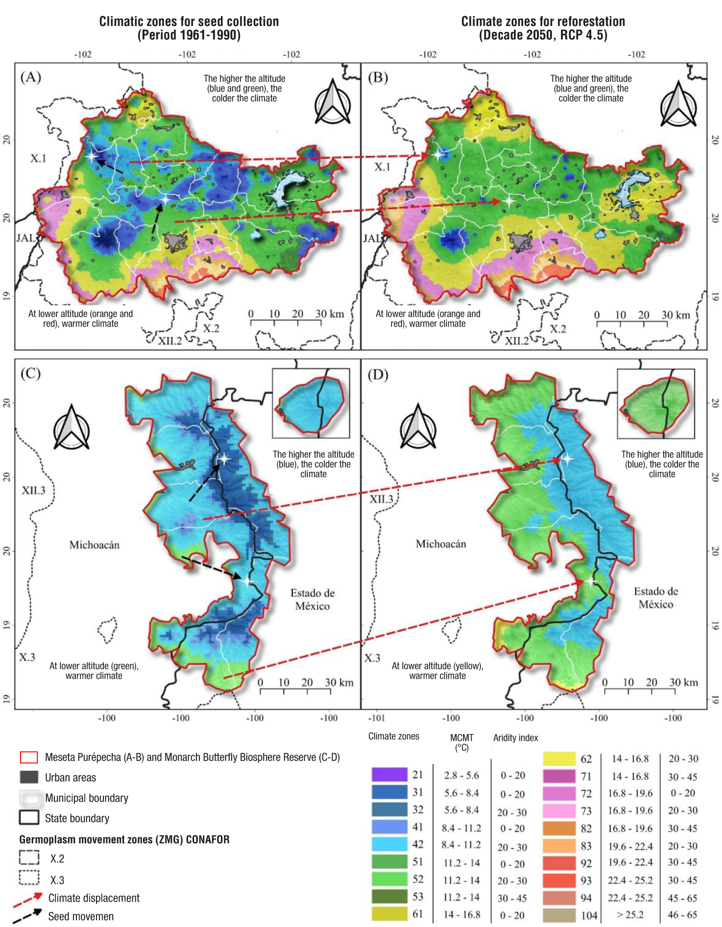 Figure 3 shows the above procedure with reforestation sites indicated with a white star. For example, the upper star of the planting site, both within the Meseta Purépecha (Figure 3A) and the MBBR (Figure 3C), is in a dark blue climatic zone (MCMT = 5 to 8 °C; IA = 2 to 20) and becomes warmer in the future (light blue, MCMT = 8 to 11 °C) and drier (IA = 20 to 30). For the lower star example (Figures 3B and 3D), the area to be reforested is light blue and becomes warmer (dark green, MCMT = 11 to 14 °C, AI = 20 to 30). For this second case, it is suggested to collect seeds under the current climate (green color), produce seedlings in the nursery and, subsequently, reforest sites where that same green climate will occur, but projected for the year 2050 (according to the maps based on the climate zones of Castellanos-Acuña et al., 2018). In practice, it would be advisable that nursery production be done in the climatic region of the site to be reforested to facilitate plant acclimatization, even if the seed is imported from warmer sites. In other words, the transfer of germplasm from the site chosen as seed source to the planting (deployment) site is preferable, as far as possible, to transport the seed for nursery supply rather than transporting the plant once it's already grown.