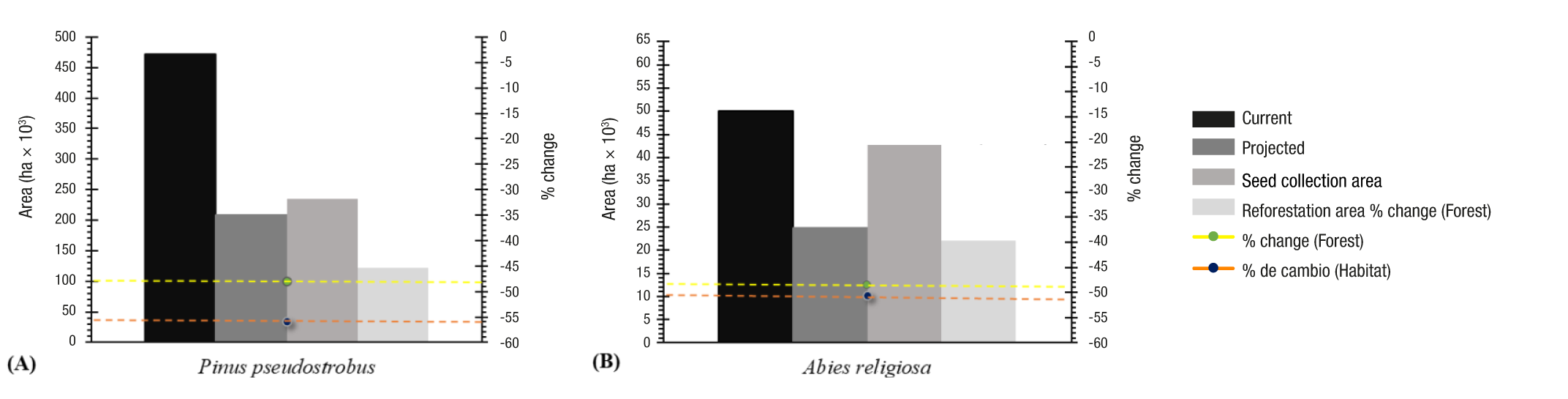 It is also important to note that the area for reforestation with the species of interest is significantly reduced when considering the expected effects of climate change, compared to the current area potentially useful for seed collection at present (Figures 4A and 4C), due to the progressive reduction of climatic habitat suitable for conifers, as a result of climate change (Figures 4B and 4D). Site options for planting a conifer species of interest are reduced because of a projected 48 % decrease in favorable climatic habitat for P. pseudostrobus in the Meseta Purépecha and 49 % in the MBBR for A. religiosa (Figure 5). This is not exclusive to the two areas studied, but a general trend for temperate forests in Mexico (Rehfeldt et al., 2012).