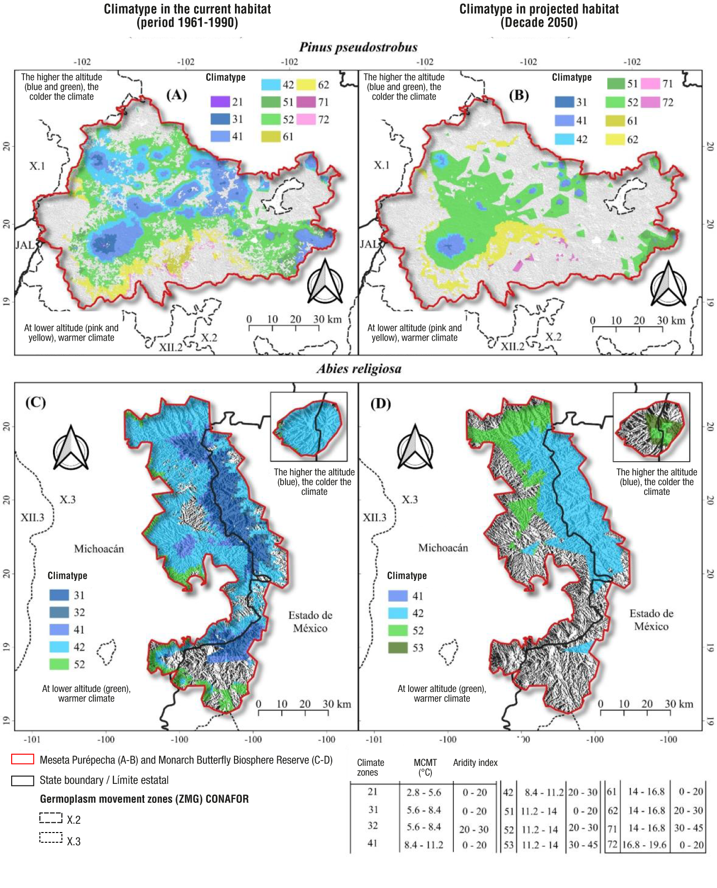 Finally, climatype maps were created, a subdivision of the climatic habitat suitable for each species resulting from superimposing on it the climate zones based on the MCMT and aridity index intervals. This to account for (at least partially) the fact that populations are adapted to a portion of the species' suitable climatic habitat and not to the whole habitat (see Sáenz-Romero et al., 2012b and Ortiz-Bibian et al., 2017 for P. pseudostrobus and A. religiosa, respectively). The climatype concept used is similar to that developed by Tchebakova et al. (2005) where the subdivision is determined by intervals of climatic values; however, in the present study, the size of the intervals was not based on the minimum significant difference between provenances, obtained in garden trials by those authors, but on zoning of Castellanos-Acuña et al. (2018).
