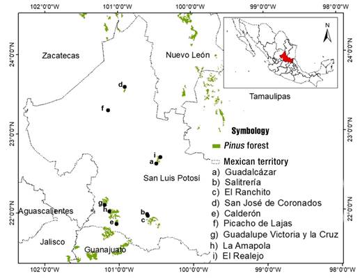 The State of San Luis Potosí is home to five species of pinyon pines, all with isolated distribution, confined to the highlands, ravines and intermountain plains, at elevations above 1 700 m (Pérez et al., 2019). One of these species is subject to special protection (Pinus johannis Rob.-Pass.) and two are considered endangered (Pinus nelsonii Shaw. and Pinus pinceana Gordon. & Glend.), due to low population density with restricted distribution, coupled with the high impact of human activities on the habitat (Secretaría de Medio Ambiente y Recursos Naturales [SEMARNAT], 2010), the most important are overgrazing by goats and cattle and the intense mining activity. Under this scenario, it is essential to describe the structure of these semiarid forests, as well as the factors that affect their dynamics, because this will allow the establishment of predictive models, management and sustainable use plans, as well as their conservation (Flake & Weisberg, 2019; Romero, Luna, & García, 2014).