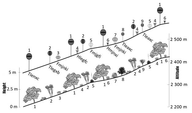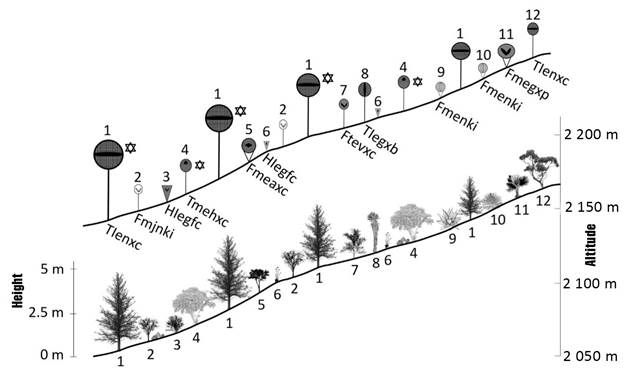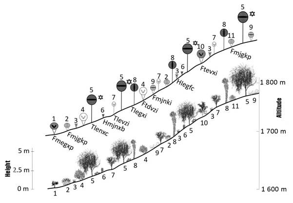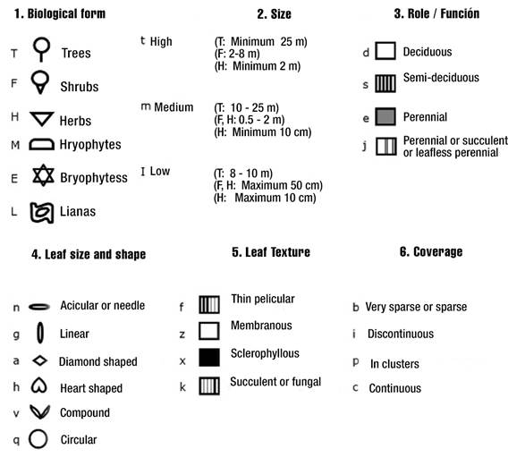 With the RIV, the most representative species and floristic associations of each site were defined. The arrangement of the most representative associations was described by physiognomic profiles (Richards, 1952) and Dansereau diagrams (Dansereau, 1957). The symbology used in these diagrams to describe the most representative characteristics by taxon is shown in Figure 2.