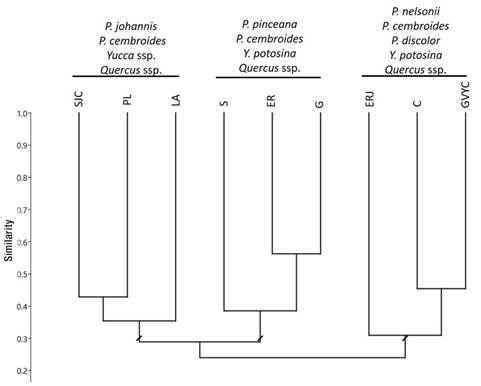 Figure 6 shows the dendrogram generated from the floristic similarity grouping analysis, with a cut-off line of 0.30 of remaining information, showing three groups. The localities in the first group are dominated by P. cembroides or P. johannis and are found further north in the state, except for the locality of La Amapola, located to the southwest; these localities are distributed at higher altitudes (2 350 m) on slopes of 20 to 30 %, where soils have low Ca concentration, but are rich in K and N (Table 1). These localities have the greatest number of species typical of xerophilous scrub.