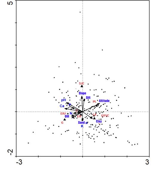 A canonical correspondence analysis was used to manage the pinyon pine forests (Figure 7), which recognizes the correlation between the floristic composition of each site and the environmental variables. Statistical values for the first three axes are shown in Table 2; the results suggest that the difference in floristic composition is mainly due to altitude, calcium, pH, organic matter, slope and texture (Table 2; Figure 7), a product of the physiography at the sites (Granados, Hernández, & López, 2012). These first three axes can explain 53.2 % of the variation among locations.