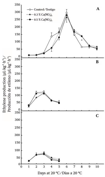 In the case of fruits stored under chilling conditions for five weeks, the three treatments showed maximum ethylene production three days after being transferred to room temperature. However, the treatment with 0.5 % calcium nitrate had the lowest value (Figure 1C), and the application of 0.3 % calcium showed no significant difference relative to the control.