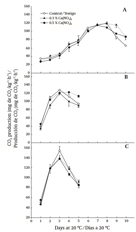 Poovaiah (1993) and Saucedo-Hernández et al. (2005) state that CO2 and ethylene production is lower in fruits which have been treated with calcium, which decreases fruit softening and improves fruit quality. Fruits stored under chilling conditions showed maximum ethylene production three days before fruits stored at room temperature. This can be explained by the fact that low temperatures cause stress that prevents the formation of ethylene, but not ACC (1-aminocyclopropane-1-carboxylic acid); therefore, once the product is removed from chilling conditions, the ethylene forms faster (Saucedo-Hernández et al., 2005; Wang, 1982).