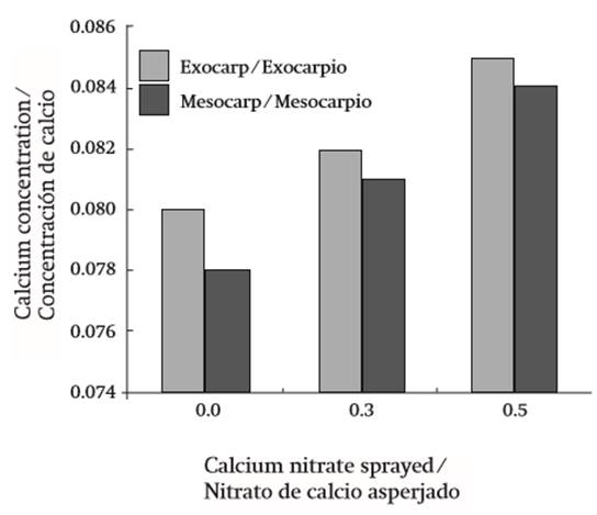 Regarding the Ca concentration in the mesocarp, the analysis of variance detected significant differences, with the 0.3 and 0.5 % treatments (0.081 and 0.084 % calcium) being superior to the control (0.078 % calcium). These values are higher than those found by Solís-Fraire et al. (1998), who obtained from 0.019 to 0.036 % without presenting differences among 1, 2 and 3 % calcium nitrate treatments. However, López et al. (1991) found concentrations between 0.166 and 0.210 %, data similar to those reported by Witney (1985), which are high compared with those found in this study.
