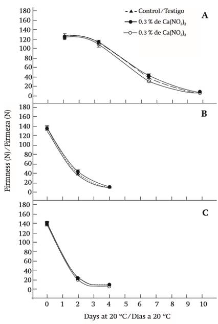 In the fruits stored for three weeks, only on the second day of exposure to room temperature did those which received 0.3 and 0.5 % calcium nitrate sprayings show a lower value than the control (Figure 1B). In this regard, Tingwa and Young (1974) and Saucedo-Hernández et al. (2005) indicated that calcium suppresses ethylene production in avocado fruits.