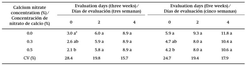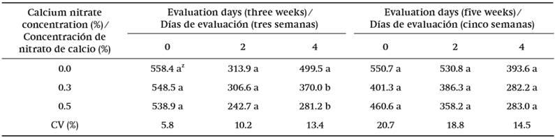 As for the fruits stored for three and five weeks at 5 °C, significant differences were found in fruit firmness on the fourth day of evaluation, with the 0.5 % calcium nitrate treatment having the most influence compared to the control (Figure 4), for these days. However, in the days prior to the evaluation there is no effect due to spraying. It has been pointed out that calcium affects ripening and firmness in avocado fruits and apple; this is because it reduces the main changes associated with the softening process, these being the loss of cell walls and the cohesion between cells, when forming part of the pectins of the middle lamella (Witney, 1985). However, this variable effect is inconspicuous.