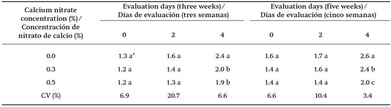This test was only able to detect, statistically, chilling injury on the fourth day of evaluation in fruits stored for three weeks at 5 °C; this was not the case at day two, with the 0.3 and 0.5 % calcium nitrate applications being the best treatments, showing lower absorbance levels (Table 4). In fruits stored under chilling for five weeks, on the fourth day of evaluation the best treatment was the 0.5 % spraying (Table 4). This increased absorbance as the days passed by was also observed by Espinosa-Cruz et al. (2014), Martínez-Damián (1990) and Saucedo-Hernández et al. (2005), and it appears to be related to softening, since in firm fruits chilling injuries are not detected with this technique, not until they are soft.