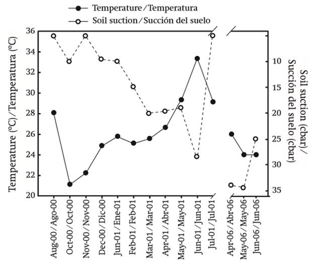 During the rainy season and shortly thereafter (August to November), soil moisture was high (5 to 10 cbar). From December moisture gradually decreased to 34 cbar (in 2000) and 37 cbar (in 2006) at the time of maximum soil drought.