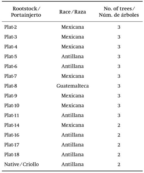 The rootstocks (RSs) were transplanted in July 2000 (start of rainy season), at a spacing of 6 x 8 m, and grafted with cv. Hass in May 2001. A total of 14 different clonal RSs previously selected for their tolerance to salinity or drought were included (Salazar-García et al., 2004b) (Table 1). As control, creole seedling RSs with phenotypic characteristics of the West Indian race were included.
