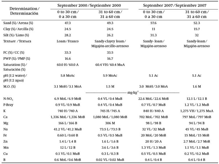 Two soil samplings were made. The first one was carried out once the RSs were established (September 2000) in five randomly-selected sites. At each site, four subsamples were obtained from 0-30 and 31-60 cm deep. Of the 20 subsamples from each depth, a composite sample was obtained from which its physical and chemical characteristics were determined in the Fertilab laboratory, which is accredited by the Soil Science Society of America’s NAPT program (http://www.naptprogram.org/pap/labs). The second sampling was in September 2007, obtaining a composite sample for the aforementioned depth, although in this case two trees were sampled for each of the one-third sections into which the orchard was divided. Texture, pH (1:2 water) (Hendershot, Lalande, & Duquette, 2008), organic matter (Nelson & Sommers, 1982), inorganic-N (Keeney & Nelson, 1982), P-Bray (Bray & Kurtz, 1945), K, Ca, Mg (Rhoades, 1982), Na, Fe, Zn, Cu, Mn (Lindsay & Norvell, 1978) and B (Bingham, 1982) were determined.