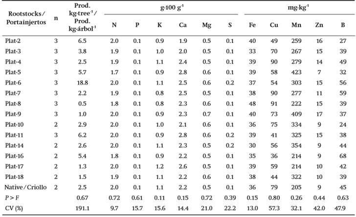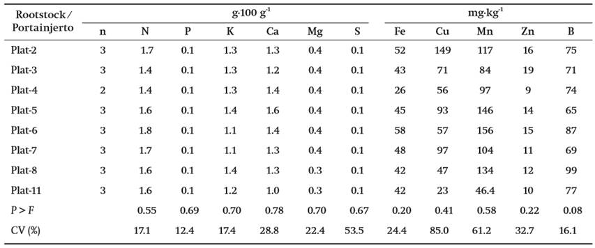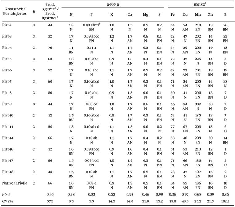 The horticultural influence of rootstock on leaf nutrient concentrations in six-year-old scions was obtained with the “System for leaf nutrient diagnosis of ‘Hass’ avocado in Nayarit” (Salazar-García, Álvarez-Bravo, & González-Durán, 2015). This system uses leaf nutrient standards for this region and classifies the concentration of nutrients as: deficient, below normal, normal, above normal and excessive.