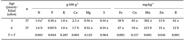 In the present study, the higher leaf nutrient concentrations in young trees (three years old) than in adults (six years old) can be attributed to lower crop nutrient demand in the young trees or to an interannual variation. In adult ‘Fuerte’ avocado trees on Mexican race rootstock seedlings, higher leaf concentrations of N, K and Ca were observed in the first year of sampling, and in the second they were of P and Mg (Herrera-Basurto et al., 2008).