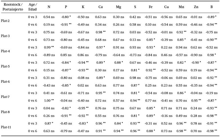 Linear correlation analysis was performed for nine clonal RSs in order to look for any type of relationship between the leaf nutrient concentrations of the rootstock before being grafted and that of ‘Hass’ at three and six years after grafting. Of the 198 correlations obtained, 59 were significant. Of the 11 nutrients analyzed in ‘Hass’, B was the most affected by the type of RS, followed by P, Ca and S. In addition to Cu, which was not affected, the least affected were N, Mg and Zn (Table 7).