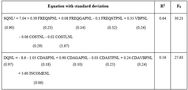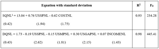 The statistical significance of the model was obtained by means of the coefficient of determination (R2), which indicates the goodness of fit of the estimated equations. The overall significance of the coefficients of each equation was observed with the F-test and the Student t distribution. The economic model was validated with the expected signs in the coefficients of each equation according to economic theory and the elasticities obtained in each equation (García-Mata, García-Salazar, & García-Sánchez, 2003).