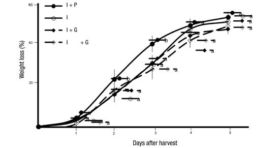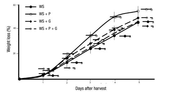 Weight loss (%). Fruits were weighed daily for five days with a balance scale (Ohaus®) and the formula applied was: