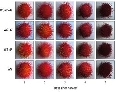 The I+P treatment showed the least thickness (2.4 mm), while WS+P and WS only presented the greatest pericarp thickness with 3.0 and 3.6 mm, respectively (Table 2). According to Caballero-Pérez et al. (2011) and van Welzen and Verheij (1991), in rambutan, the thickness of the pericarp is 2 to 4 mm, depending on the cultivar; in addition, some authors state that size, composition, and color are important marketing characteristics and that they define shelf life behavior (Aparecida-de Andrade, de Macedo-Lemos, Geraldo-Martins, de Paula, & Pitta-Junios, 2008; Hernández-Arenas et al., 2010). On the other hand, Huang et al. (2004) showed that litchi cv. Huaizhi fruits with thicker spongy tissue in the pericarp showed minor dehydration.