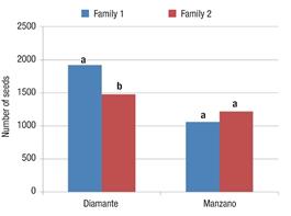 In Diamante differences were found between families for number of seeds and weight of 100 seeds; this implies that there is diversity among the families of this variety, unlike those of Manzano Tepetlixpa that did not differ in relation to the same variables.