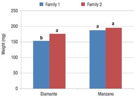 This factor had significant effects for the TNS and W100S variables. In Figure 1 it can be seen that family one of the Diamante variety obtained significantly higher TNS than family two, whereas the Manzano Tepetlixpa families did not exhibit a significant difference in this same variable.