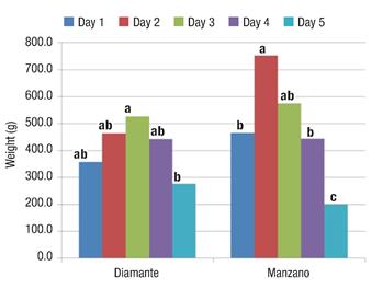 When pollinating the third day, Diamante managed to reach a higher FW (Figure 3), but it did not statistically differ from days one, two and four, which indicates that with pollination during the first four days fruits of similar weight are obtained in the Diamante variety. On the other hand, Manzano Tepetlixpa reached its highest FW on the second day, although it did not statistically exceed the third day.