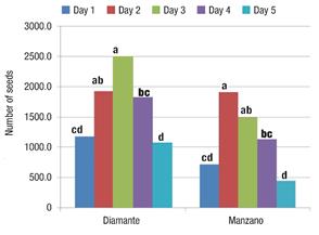 When analyzing the variables FW and TNS together, it can be seen that both varieties obtained better results when pollinating on days two and three, since it is when better fruit development and a greater amount of seed is achieved. This indicates that the greatest amount of seed is obtained by pollinating on day three for Diamante and on day two for Manzano Tepetlixpa. The above differs from the findings reported by Pérez-Grajales et al. (1998), who point out that pollination should be done in closed flower buds, possibly because they used different varieties.