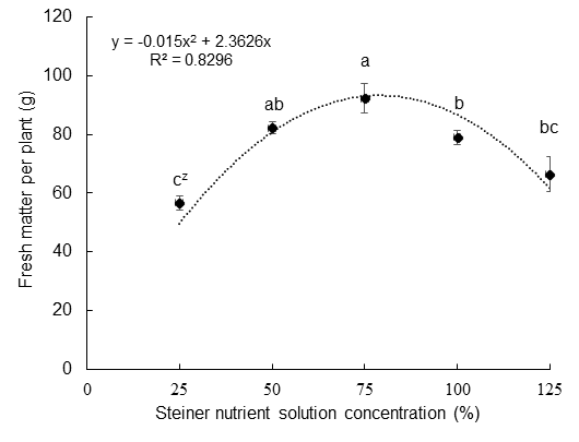 In terms of biomass production, NS treatments at 50 and 75 % had the highest total fresh and dry matter production (P ≤ 0.05), while those at 25 and 125 % had the lowest biomass production (Table 3). Both fresh and dry matter are the product of economic interest in the crop, and these results allow us to define that the 50 and 75 % Steiner NS concentrations are optimal for oregano production in hydroponic systems; however, the 50 % NS concentration represents a lower use of fertilizers compared to the 75 % one.