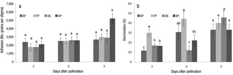 Analysis of the pollen-pistil interaction showed no differences among treatments in the adhesion of pollen grains (P > 0.05). There was a slight increase in the number of grains adhered to the oldest flowers, indicating that the receptivity of the stigma was maintained until 9 dap. FP and XS treatments showed about 1,900 pollen grains per flower, while XP and SP had about 2,000 and 2,200 pollen grains per flower, respectively, at 3 dap. At 6 dap, the differences were small and not significant (2,700 pollen grains per flower for SP and FP, and 2,800 pollen grains per flower for XS and XP). The oldest flowers (9 dap) showed the highest number of pollen grains, reaching 3,000 grains in all treatments, with the exception of XP which averaged 5,500 pollen grains in the stigma (Figure 1a).
