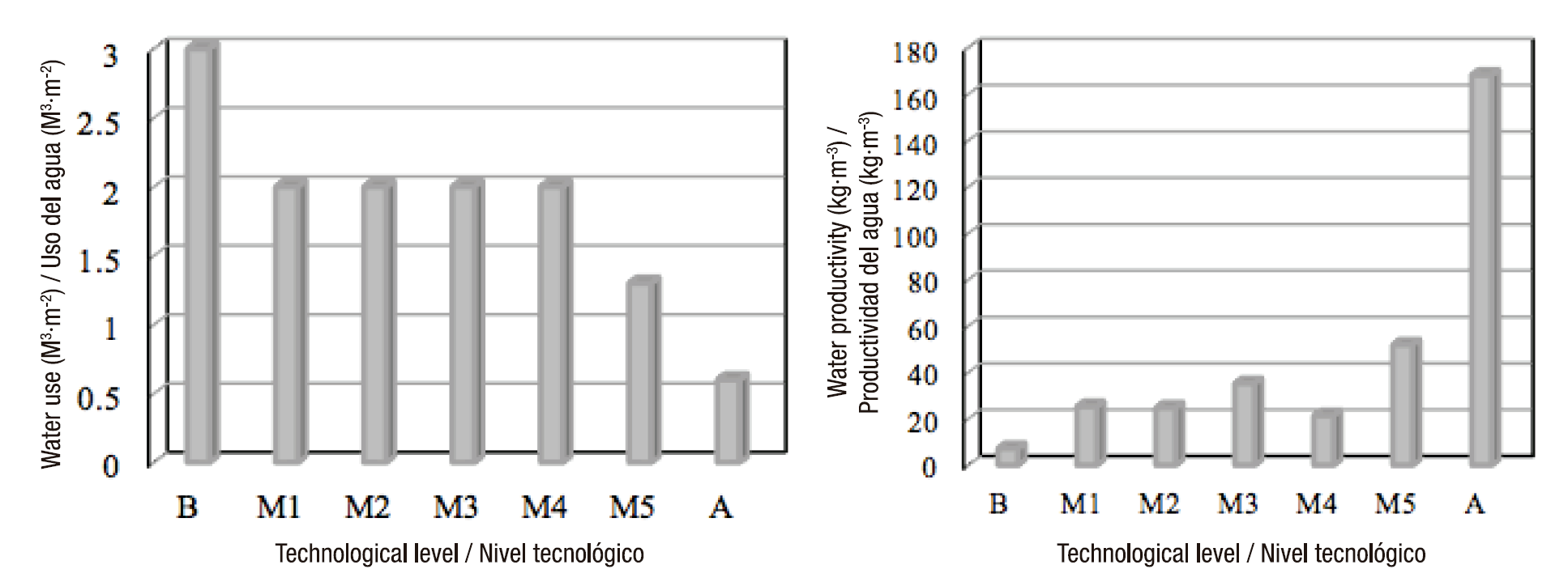 The WUE figures for tomato cultivation depend on several factors, among them the technology level, as shown in Table 1 where the amount of irrigation water needed to produce 1 kg of fresh tomato, from different farming systems, is broken down. With the most advanced technology, only 4 L of water are required to produce 1 kg of tomato. Figure 1 shows a summary of water use and productivity for seven technological levels of tomato production, obtained from a simulation model based on physical equations that describe the heat and mass flows associated with greenhouse tomato production established by Elings, Campen, Nieves-García, and van der Valk (2013) for the conditions of Aguascalientes, Mexico. As the technological level increases, water use decreases and water use productivity increases, which is more noticeable when going from medium technological level 5 (M5) (51.9 kg·m-3) to the high technological level (A) (168.2 kg·m-3); the only difference between the two was that at level A thermal screens and mechanical cooling were added.