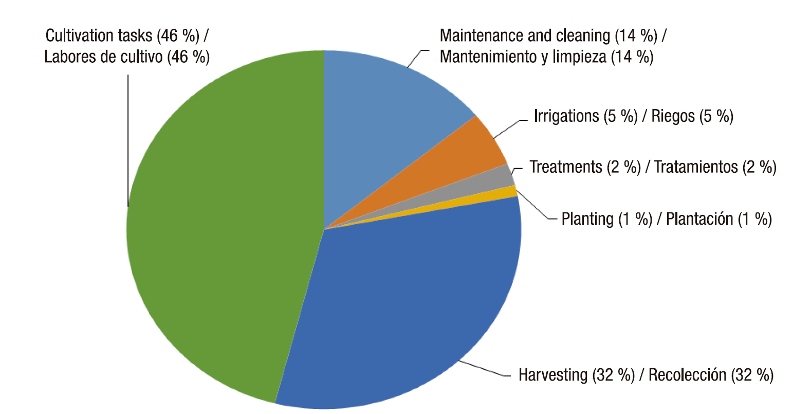 According to Pérez-Mesa, de Pablo-Valenciano, and Escudero-Moreno (2004), in a study conducted in Almería, Spain, in a plastic greenhouse with tomato cultivation, labor accounted for almost 35 % of total operating costs, and 60 % of the workforce was engaged in tasks such as pruning, tutoring and cleaning in the greenhouse. Figure 3 shows the percentage of labor used in different operations in a greenhouse, for a total of 3,900 h·ha-1 (Pérez-Mesa et al., 2004).