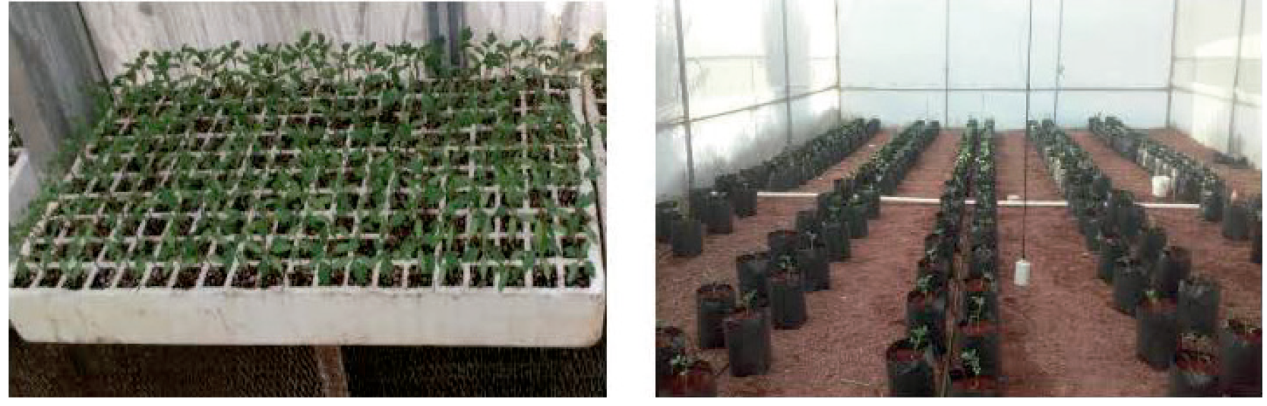 Sowing of the commercial Saladette-type tomato (Solanum lycopersicum) hybrid ‘El Cid F1’ (purchased at the “El Field” agro-inputs store) was carried out on March 6, 2016 in 200-cavity polystyrene trays. One tomato seed was placed in each tray cavity, covered with 0.5 cm of peat moss substrate and watered manually. On March 22, 2016, the seedlings emerged, and transplantation was carried out on April 24 in 10 L bags at a distance of 30 cm between each bag and 80 cm between rows, with a density of 3.5 plants·m-2; volcanic rock (tezontle) was used as substrate (Figure 5). Irrigation was carried out manually in the first days; after transplantation, a drip fertirrigation system with PVC valves and 16 mm tubing with 8 L·h-1 dripper capacity and a four-outlet distributer was used. Twelve irrigations were performed per day, increasing the irrigation time according to the phenological stage (Figure 6). Steiner nutrient solution was used for fertilization (Steiner, 1980).