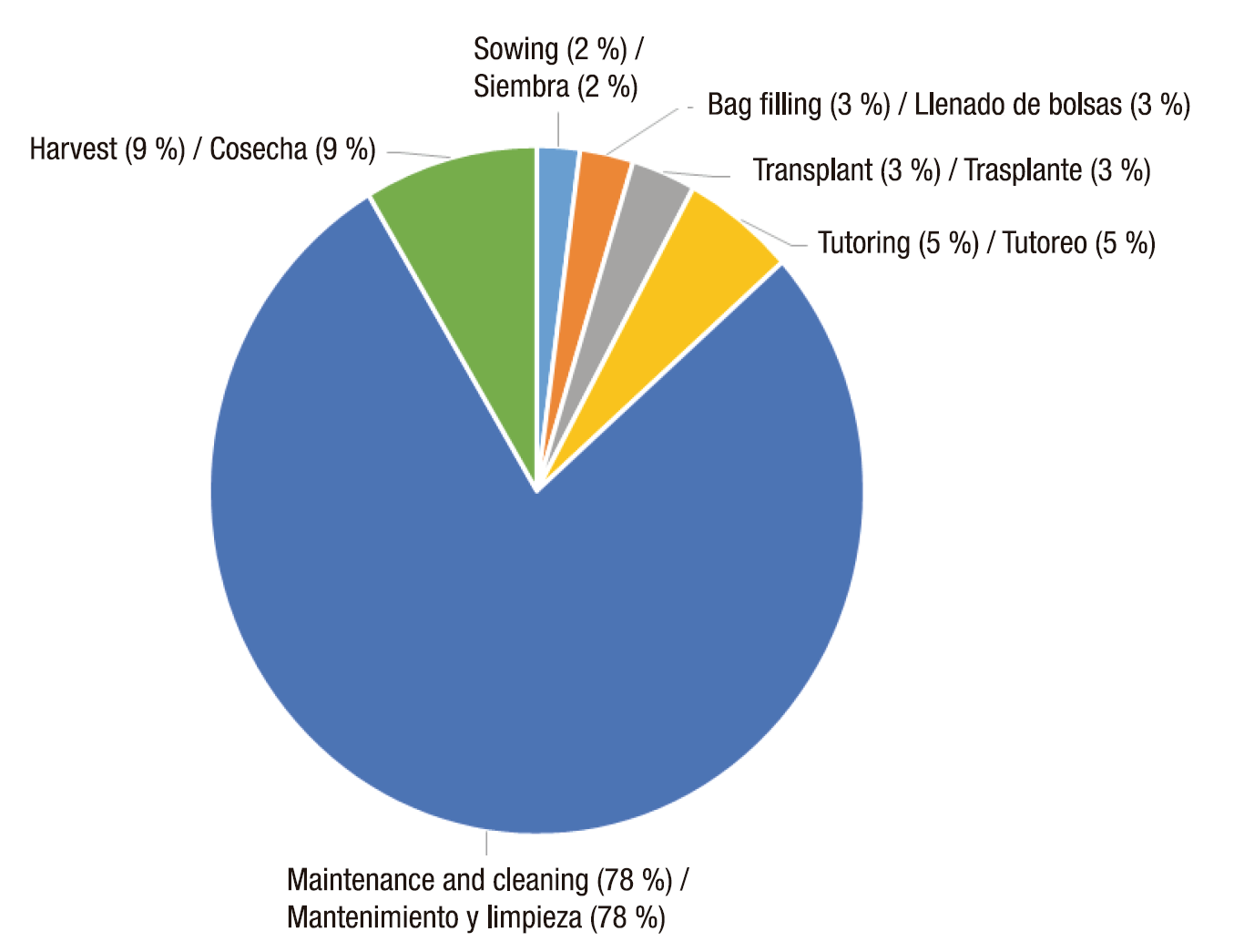 Maintenance and cleaning occupied 78 % of the workforce during the production cycle, higher than that reported by Pérez-Mesa et al. Labor productivity was 3.019 kg·h-1.