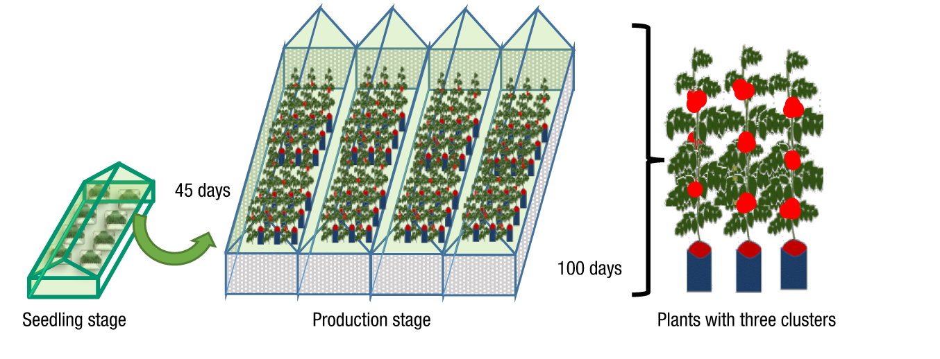 The viability of the three-stage system with three clusters is based on the fact that, at 45 days, the plants have a reduced leaf area, which allows their temporary management at high density without the leaf area index (LAI) generating problems of competition for light. The combination of the seedbed and intermediate stages allows the crops to be staggered over time and reach up to seven annual cycles in the final production greenhouse. This represents the potential to double the annual yield compared to the previous three-cycle, two-stage system. However, overextending the duration of the intermediate stage can induce light competition due to increased leaf area and LAI (Jishi, 2018), which could negatively affect plant growth and yield (Taiz et al., 2018). Heuvelink et al. (2018) and Heuvelink et al. (2020) suggest that the optimal LAI to maximize tomato production is between 3 and 4.