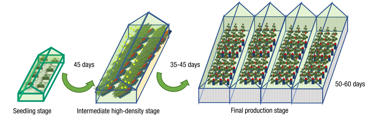 The seedbed stage maintains its approximate duration of 45 days. Subsequently, the seedlings are transplanted into bags or pots with hydroponic substrate and carried with wire rod staking in an additional smaller greenhouse, where the plants are managed at high population density (18 to 25 plants∙m-2) for 35 to 45 days. To ensure economic viability, this intermediate stage should not occupy more than 30 % of the greenhouse surface area designated for the final stage. Between 80 and 90 das (i.e., 35 to 45 days after transplanting) the plants are moved to the final production greenhouse (7 to 8 plants∙m-2), thus beginning the final production stage, which lasts 50 to 60 days (Figure 2).