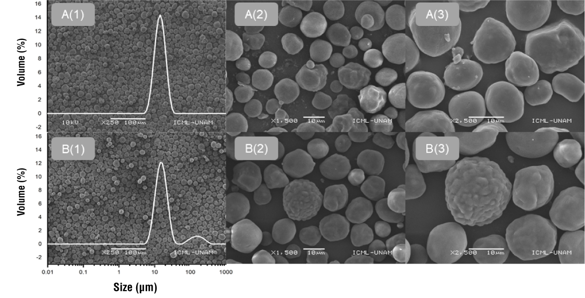 The span value was significantly higher in CCOSA, being 4.8 times larger than that of CC. This finding is related to a broader particle size distribution, which could be explained by the greater tendency of starch granules to agglomerate (Domene-López et al., 2019). CC granules showed a unimodal distribution (Figure 1A(1)), with the highest peak at 14.39 ± 0.03 µm. CCOSA granules, on the other hand, showed a bimodal distribution (Figure 1B(1)), with a large peak at 15.02 ± 0.01 µm and a small one at 158.73 ± 0.03 µm.