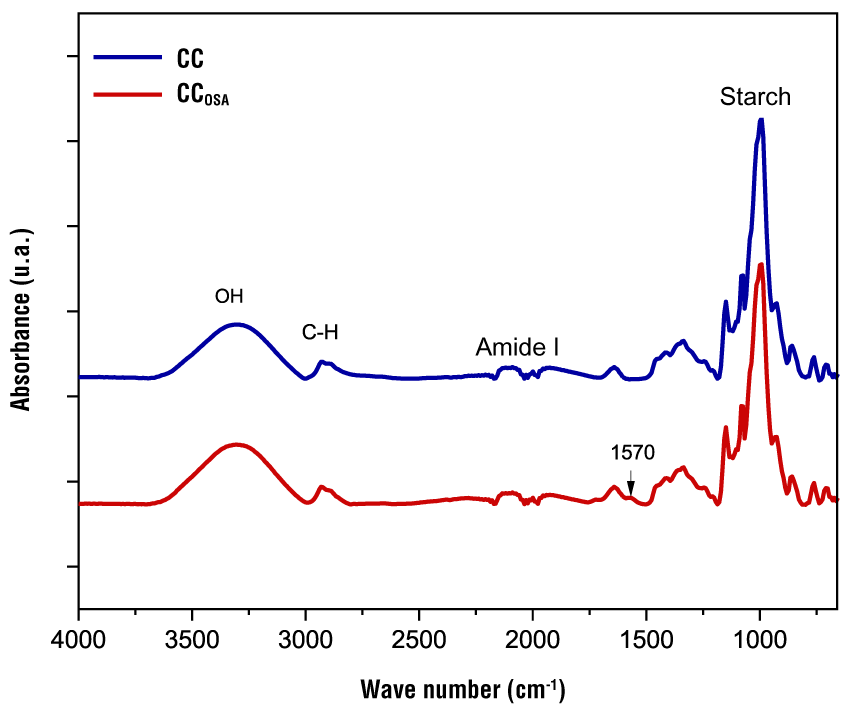 The infrared spectra of the starches (CC and CCOSA) are presented in Figure 2. The formation of carboxylate groups was confirmed by this technique. It can be seen that native and modified starch have similar profiles. A broad peak is detected in the range of 3 500 to 3 000 cm-1, which is related to the presence of starch hydroxyl groups (O-H). The peaks at 2 930 and 2 880 cm-1 are attributed to the antisymmetric and symmetric stretching vibration of aliphatic groups CH2 and CH3, and be attributed to free fatty acids (Wei et al., 2020). The band in the range of 1 700 to 1 600 cm-1 is related to the amide I group, suggesting the presence of protein on the surface of starch granules. The fingerprint of starches is presented in the most prominent peak between 1 100 and 920 cm -1, where a stretching of the C-O bond was observed (Lu et al., 2019).