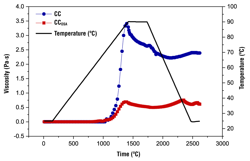 The magnitude of the peak viscosity of CC starch was much higher than that of CCOSA. The chemical modification revealed in FTIR and structural changes limited the amorphous region of the granules to trap water and, consequently, a lower peak viscosity was presented (Salazar-Irrazabal et al., 2023). The breakdown viscosity of the starches varied between 0.19 and 1.18 Pa∙s, where the highest value was presented by CC, indicating that this starch had greater stability than those modified with OSA. Núñez-Bretón et al. (2024) point out that this behavior is due to a restructuring of its fractions and a greater rearrangement of the polymeric matrix. Likewise, the final viscosity of CCOSA was significantly lower than that of CC. Won et al. (2017) found a similar trend in OSA-modified potato starch when compared to its native counterpart.