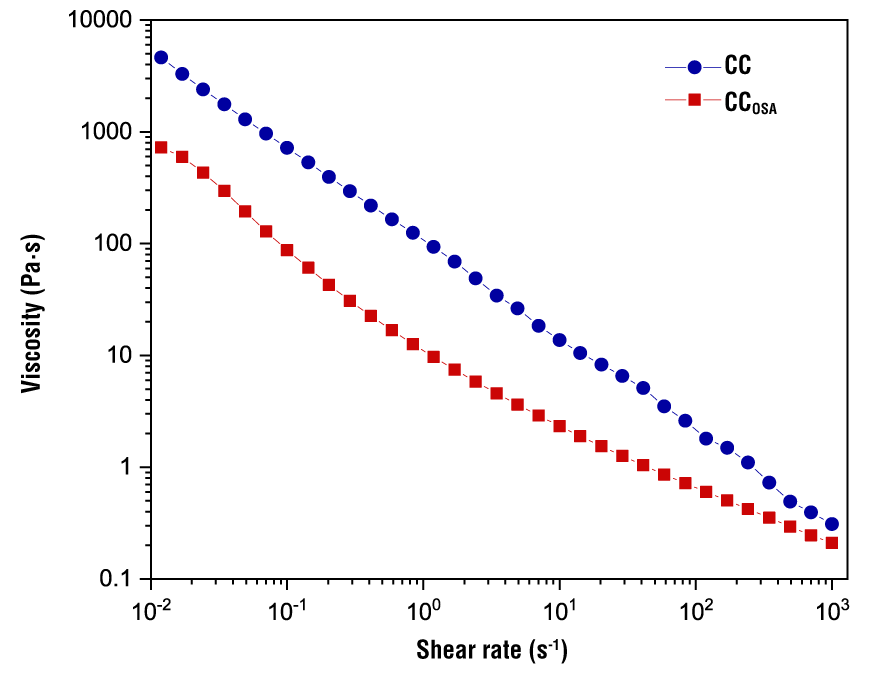 Figure 4 shows typical apparent viscosity curves as a function of shear rate for 5 % starch gels. A similar shear thinning behavior is observed for both gels (CC and CCOSA); that is, the viscosity decreases as the shear rate increases. This behavior is associated with an alignment of the biopolymer molecules at the applied shear rate, which modifies their original conformation and the biopolymer-biopolymer interactions are disrupted, thereby decreasing the interaction strength between the flow layers (Cortés-Viguri et al., 2021). It can be seen that CC presented the highest viscosity values throughout the shear rate range.