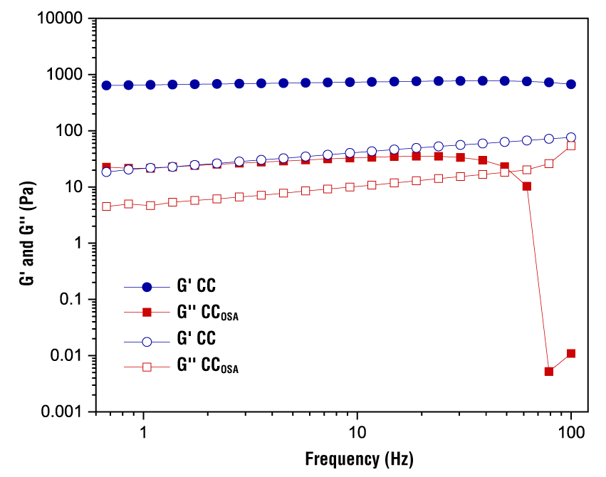 Changes in storage (G’) and loss (G’’) moduli as a function of frequency for CC and CCOSA gels are shown in Figure 5. The magnitudes of G’ of CC were relatively higher than those of G’’, suggesting that the gels exhibited more elastic than viscous behavior. The storage modulus of CC increased over the entire frequency range, indicating the formation of interconnected networks resembling elastic gels. However, CCOSA gels exhibited regular increases in G’ and G’’ at frequency values below 25 Hz, while at higher values there was a gradual decrease up to 65 Hz, a frequency at which G’ decreased dramatically, accompanied by a change from elastic to viscous character. OSA modification of starch had a significant effect on the consistency of the gels. Zhang et al. (2021) point out that octenyl succinate groups in starch can modify its hydrophobicity by weakening intramolecular hydrogen bonds, as more hydroxyl groups interact with water molecules, which limits interactions in the amylose chain and reduces gel strength. This is more evident as the DS increases.