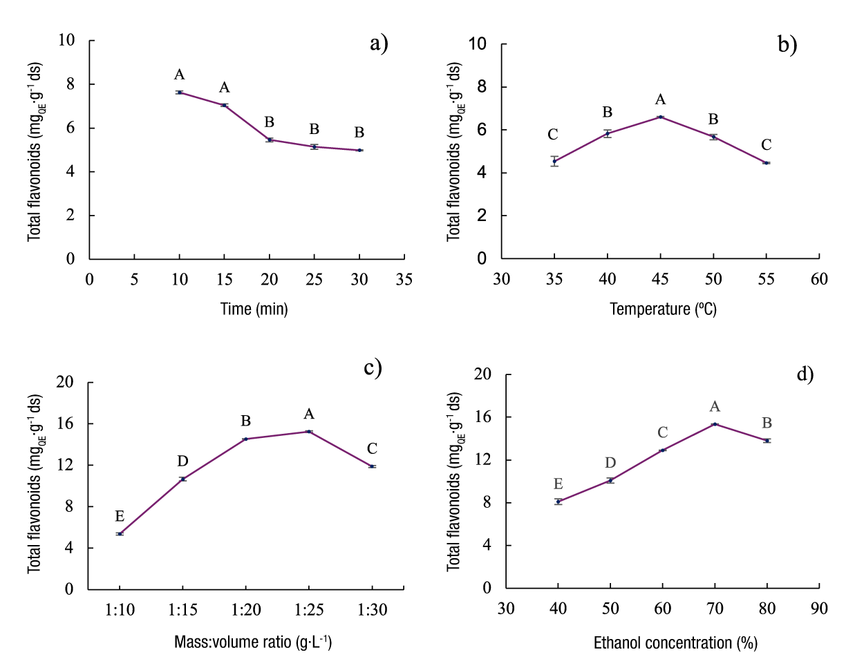 Time is a fundamental parameter in the extraction process, as it directly influences the yield, quality, energy consumption and cost of the process (Vinatoru et al., 2017). Therefore, it is crucial to optimize the microwave irradiation time from the beginning of the process. To determine the effect of irradiation time on flavonoid extraction, 12 g of A. lechuguilla guishe and 120 mL of 70 % ethanol were used. The irradiation time varied from 10 to 30 min at a constant temperature of 40 °C. Figure 1a shows that the maximum extraction of total flavonoids (7.62 ± 0.05 mg QE·g-1 ds) was reached at 10 min of irradiation, which is attributed to the increase in molecular motions and the heat generated, factors influenced by the ionic condition and dielectric properties of the solvent (Sonar & Rathod, 2020).
