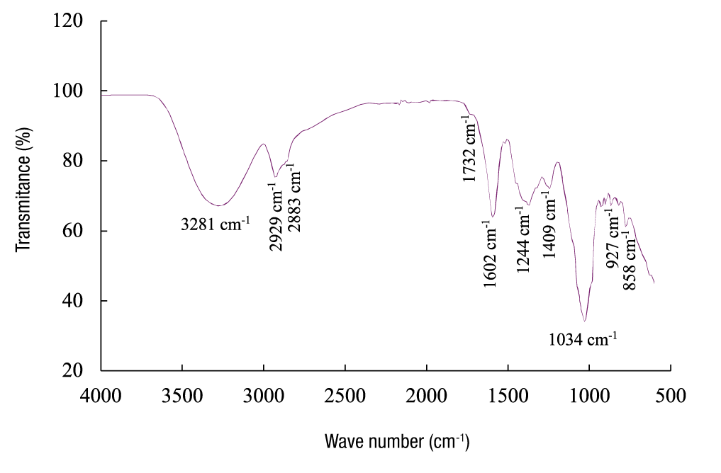 The FTIR spectrum of the guishe extract showed several characteristic bands (Figure 2). The band at 3 281 cm-1 (Figure 2) is associated with O-H stretching, while the bands at 2 929 and 2 883 cm-1 correspond to C-H stretching. The band at 1 732 cm-1 is probably related to the vibration of carboxyl groups (C=O stretching) present in flavonoids. A band at 1 602 cm-1 attributed to the stretching of C=C groups, related to deformations of aromatic rings, was also observed. The band at 1 409 cm-1 is related to CH3, CH2 groups, flavonoids and aromatic rings, and reflects the C-H bending vibration (δ) and stretching of aromatic rings. The band at 1 244 cm-1 is attributed to the vibration of the C-O group of hydroxyflavonoids. The band at 1 034 cm-1 is related to secondary alcohols and C-O stretching of ester groups. Finally, bands at 927 and 858 cm-1 were found, corresponding to out-of-plane C-H bending vibrations, indicating substitutions in the aromatic ring (Carlota-da Silva et al., 2020; Krysa et al., 2022; Nunes et al., 2016).